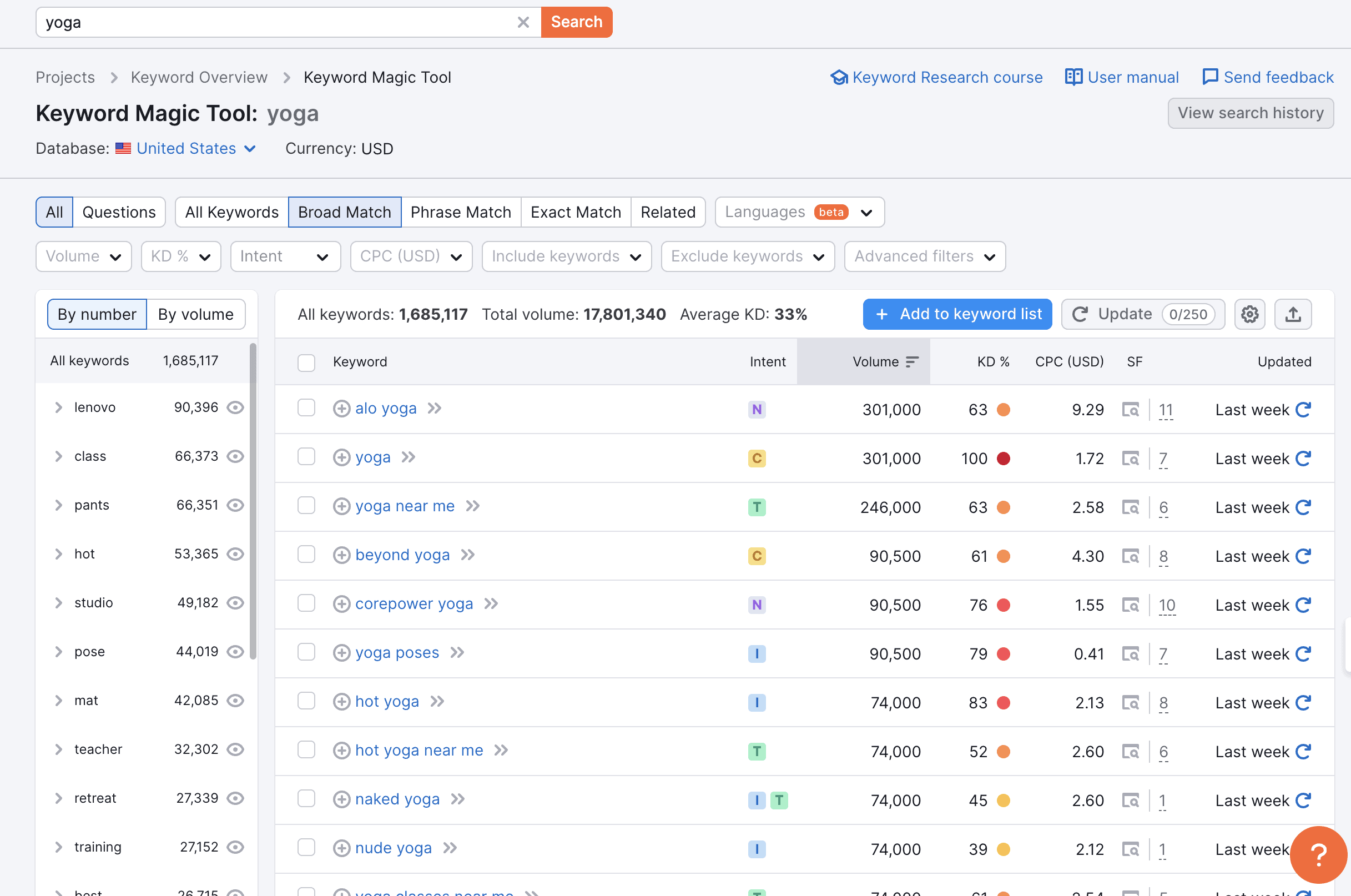 With the Keyword Magic Tool, it’s super simple to just plug in a broad seed keyword (like “yoga”) and get hundreds of content ideas at your fingertips in seconds, ready to explore further.